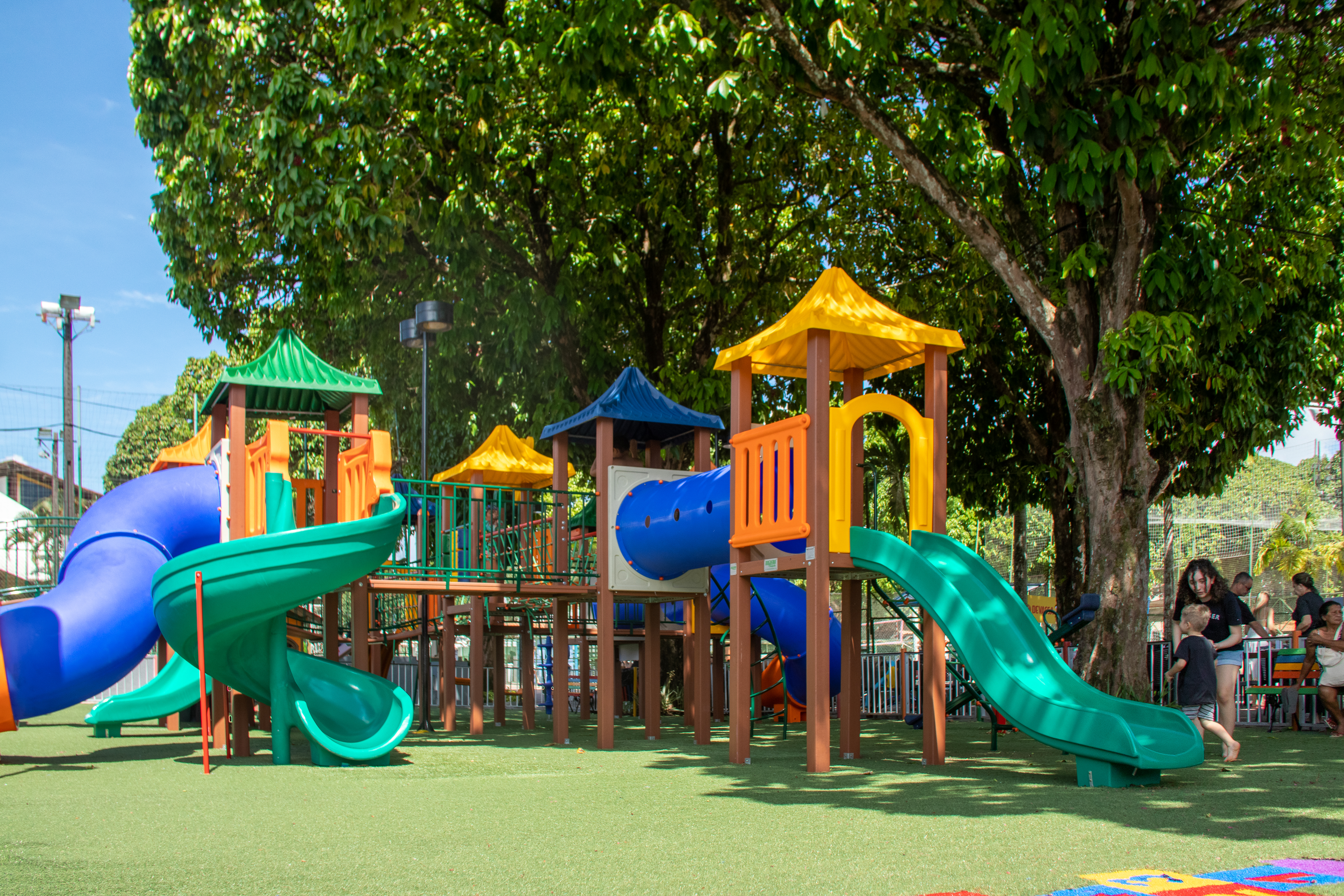 O espaço recebeu mais cores, novos brinquedos e uma nova grama que amortece o impacto, garantindo ainda mais segurança para a garotada.